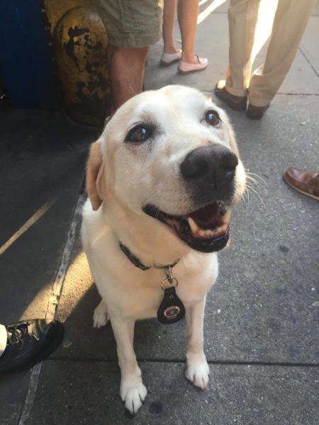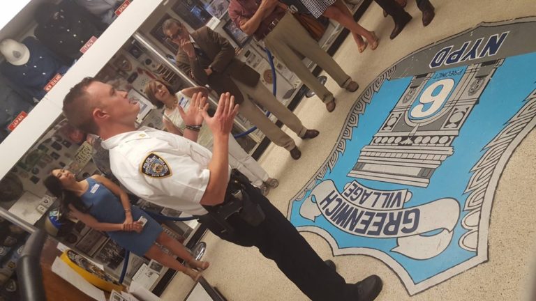 Getting down to business: Members of the Greenwich Village-Chelsea Chamber of Commerce recently toured the Sixth Police Precinct’s stationhouse on W. 10th St. and also the adjoining Bomb Squad headquarters on Charles St. The Bomb Squad’s super-sniffing dog was happy to say hi to the local business leaders, as were members of the precinct’s detectives squad. The chamber also recently toured the East Village’s Ninth Precinct stationhouse.